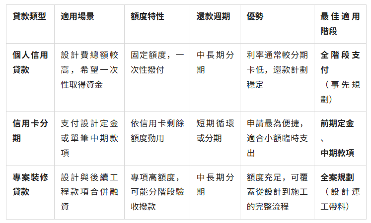 • 總體負債須評估:申請前,請務(wù)必將後續(xù)的工程款、傢俱家電採購等大筆支出納入考量,理性評估自己的還款能力,避免解決了設(shè)計費壓力,卻換來更沉重的財務(wù)負擔。